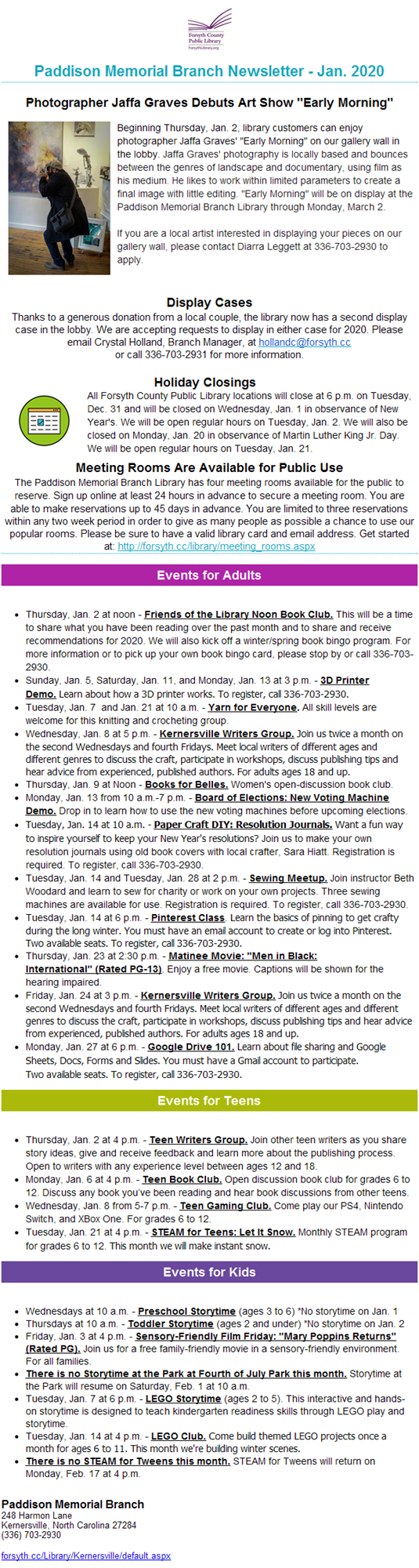 Sign up for this monthly newsletter and stay in the know about what's going on at the library. There's something for all ages! You can call us at 336-703-2930 or email crousejc@forsyth.cc to get started.
