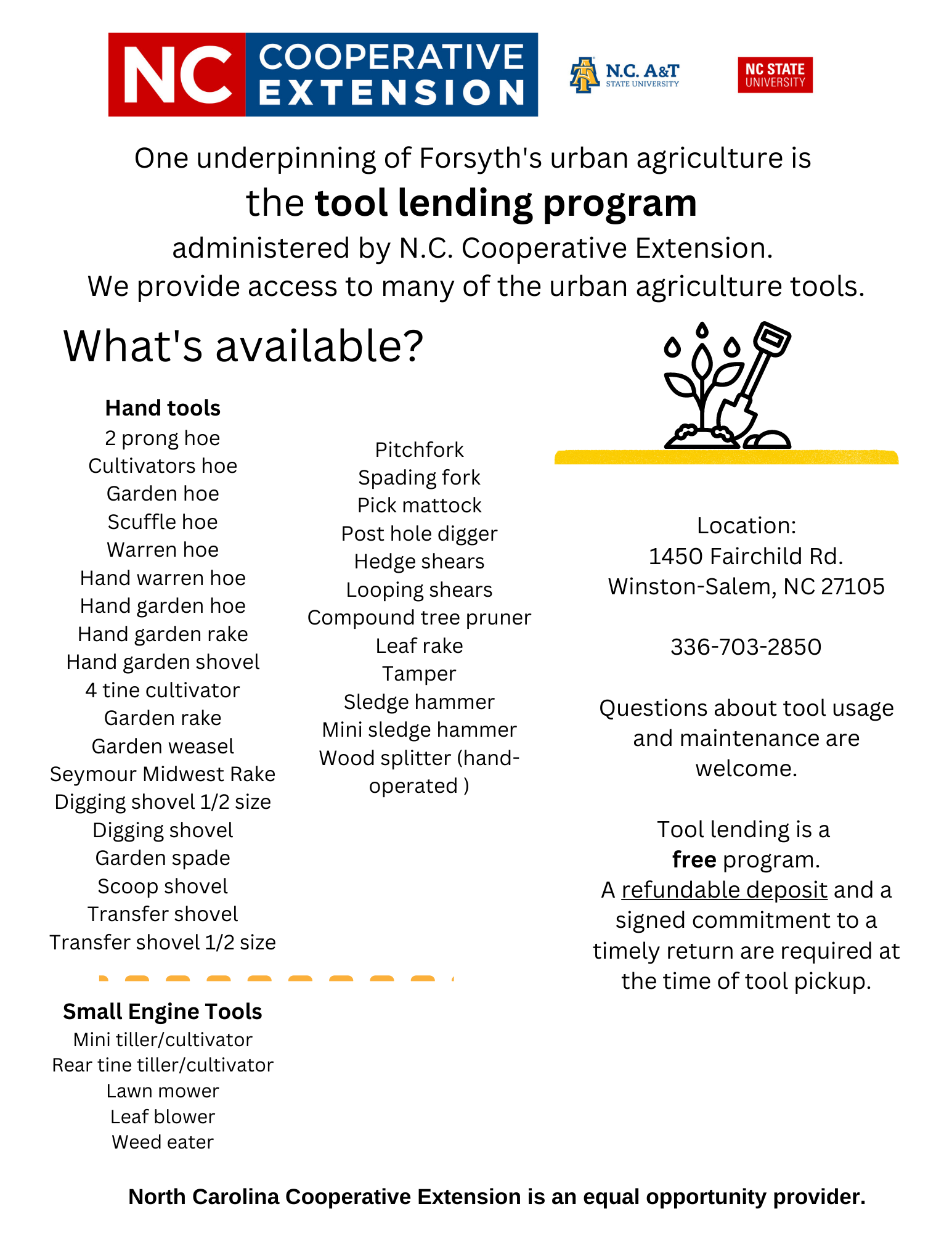 One underpinning of NCCE Forsyth County Center's urban agriculture support role is its tool lending program. We provide access to many urban agriculture tools.